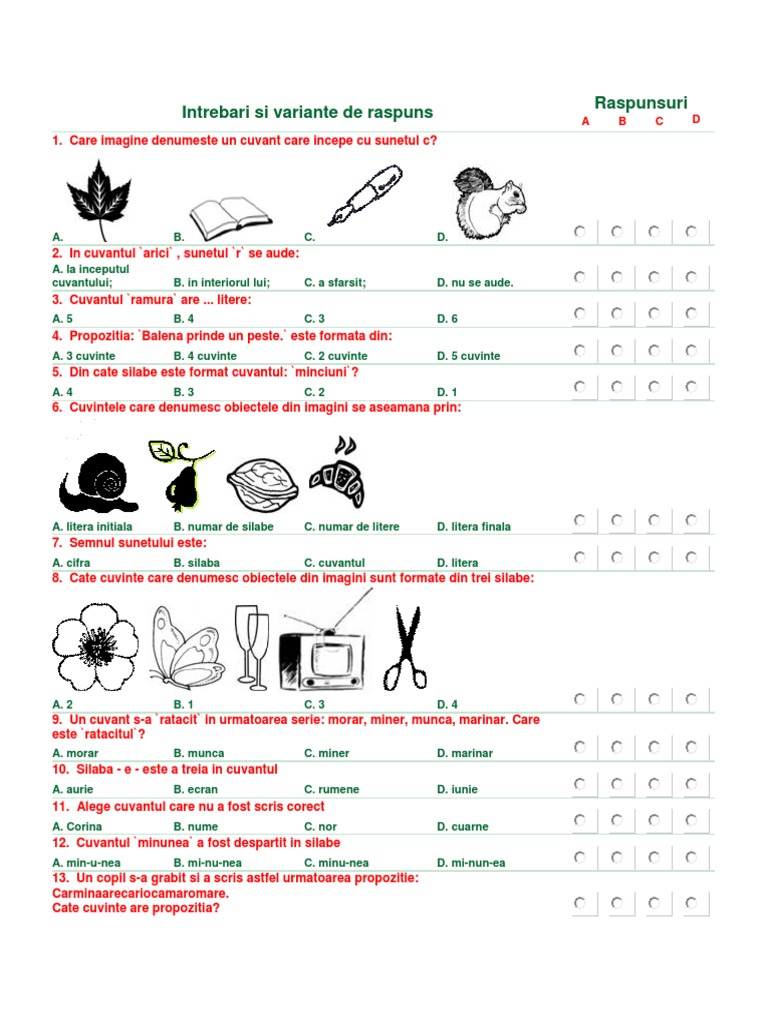 Cuvinte care încep cu litera: Încep cu se termină cu conțin anagrame definiții. Itemii de răspuns au fost concepuți astfel încât să evidențieze eventuale confuzii grafice sau fonetice între litere/ sunete.