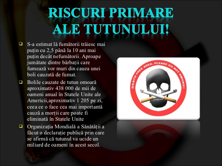 Organizaţia mondială a sănătăţii a făcut o declaraţie publică prin care se afirmă că tutunul va ucide un miliard de oameni în acest secol. Tigarile potenteaza periculos efectele secundare ale. Plămâni pancreas căi urinare piele şi dinţi oase inimă creier gură şi faringe uter şi ovare testicule sistem circulator laringe şi trahee.