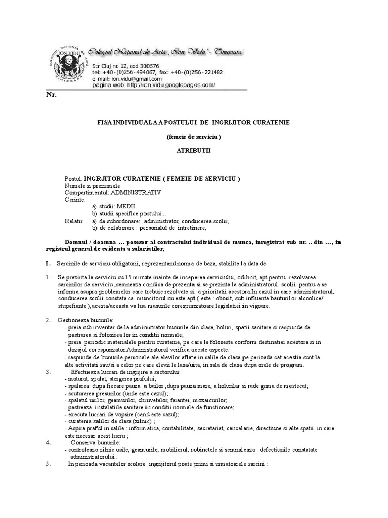 Fisa postului, fisa post, femeie de serviciu, cod cor 911201. Ing director general, fisa postului denumirea postului: