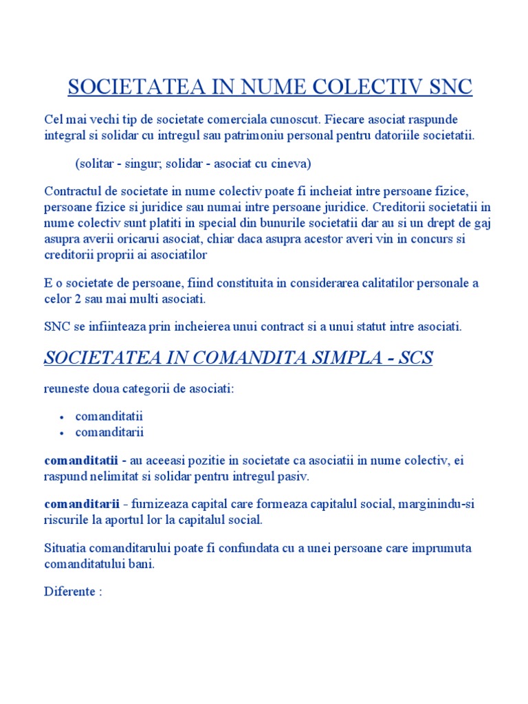 vizitati articolul complet aici : https://ro.scribd.com/document/339721081/Societate-in-Nume-Colectiv Creditorii societatii in nume colectiv sunt platiti in special din bunurile societatii dar au si un drept de gaj asupra averii oricarui asociat. Din societate + în + nume + colectiv. Fiecare asociat răspunde integral şi solidar cu întregul său patrimoniu personal pentru datoriile societăţii.