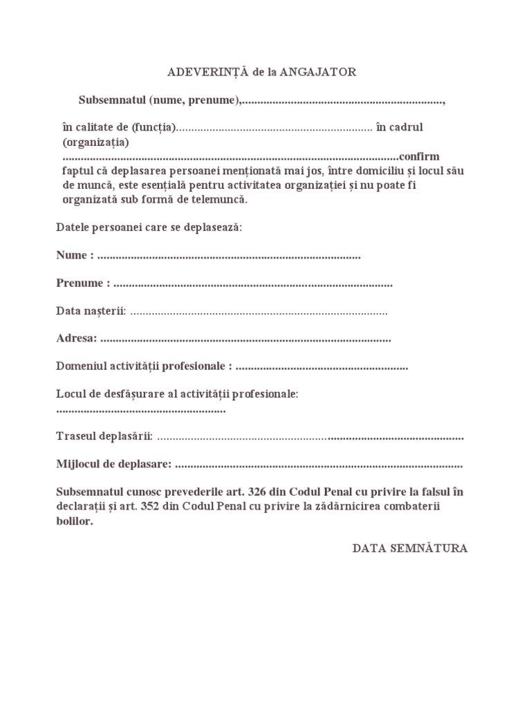 Adeverinţa nu trebuie să prezinte ştersături, adăugiri ori alte vicii de formă sau fond.(conform instrucţiuni apsmb nr. Cate declaratii pe propria raspundere si adeverinte de angajator am tiparit de la inceputul starii de urgenta? Adeverință de la angajator pentru deplasarea în interes de serviciu.