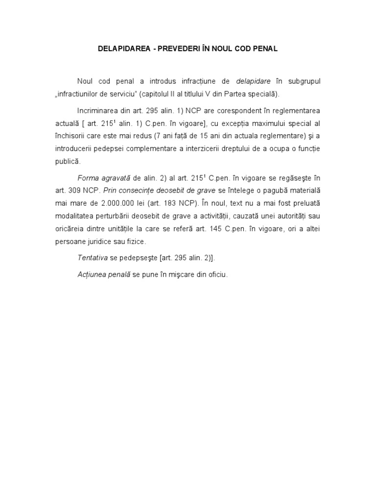 Faţă de codul penal 1969, sunt modificări în ce priveşte cuantumul pedepsei, care în general scade. 135/2010 privind codul de procedură penală, publicată în monitorul oficial nr. 81 cod penal va dispune suspendarea condiţionată a executării pedepsei şi în baza art.